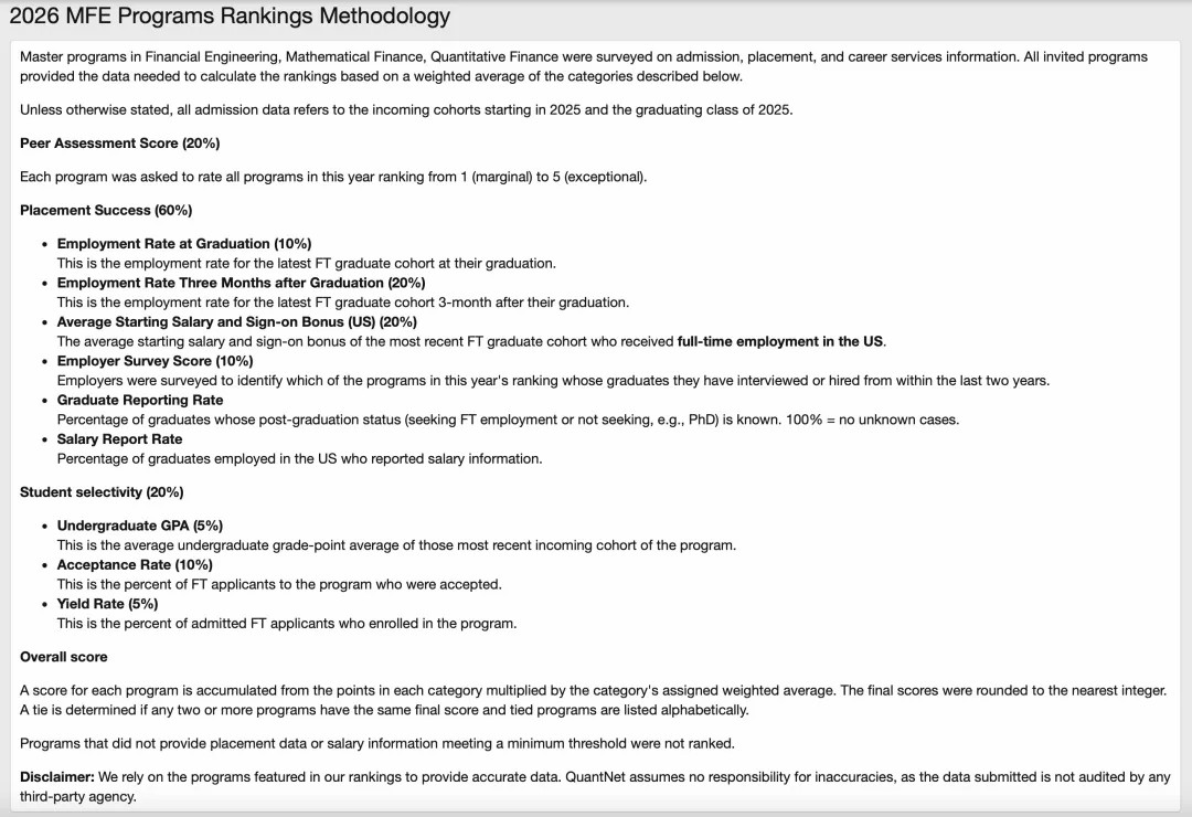 近日,美国金工/金数圈的专排扛把子——QuantNet,正式发布了2026MFE金融工程排名!