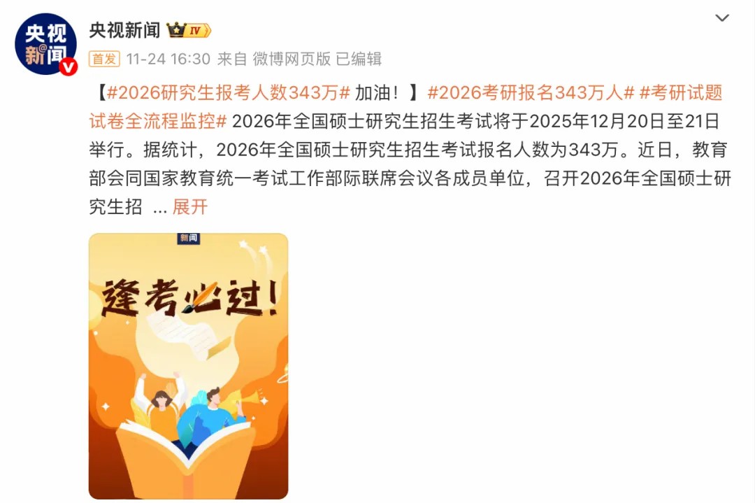 2026年全国硕士研究生招生考试将于2025年12月20日至21日举行。据统计,2026年全国硕士研究生报名人数为343万。考研报名总人数继去年迎来下降拐点后再次下滑,据悉,2025年全国硕士研究生招生考试报名人数为388万。相比去年,今年报名人数直线下跌45万。