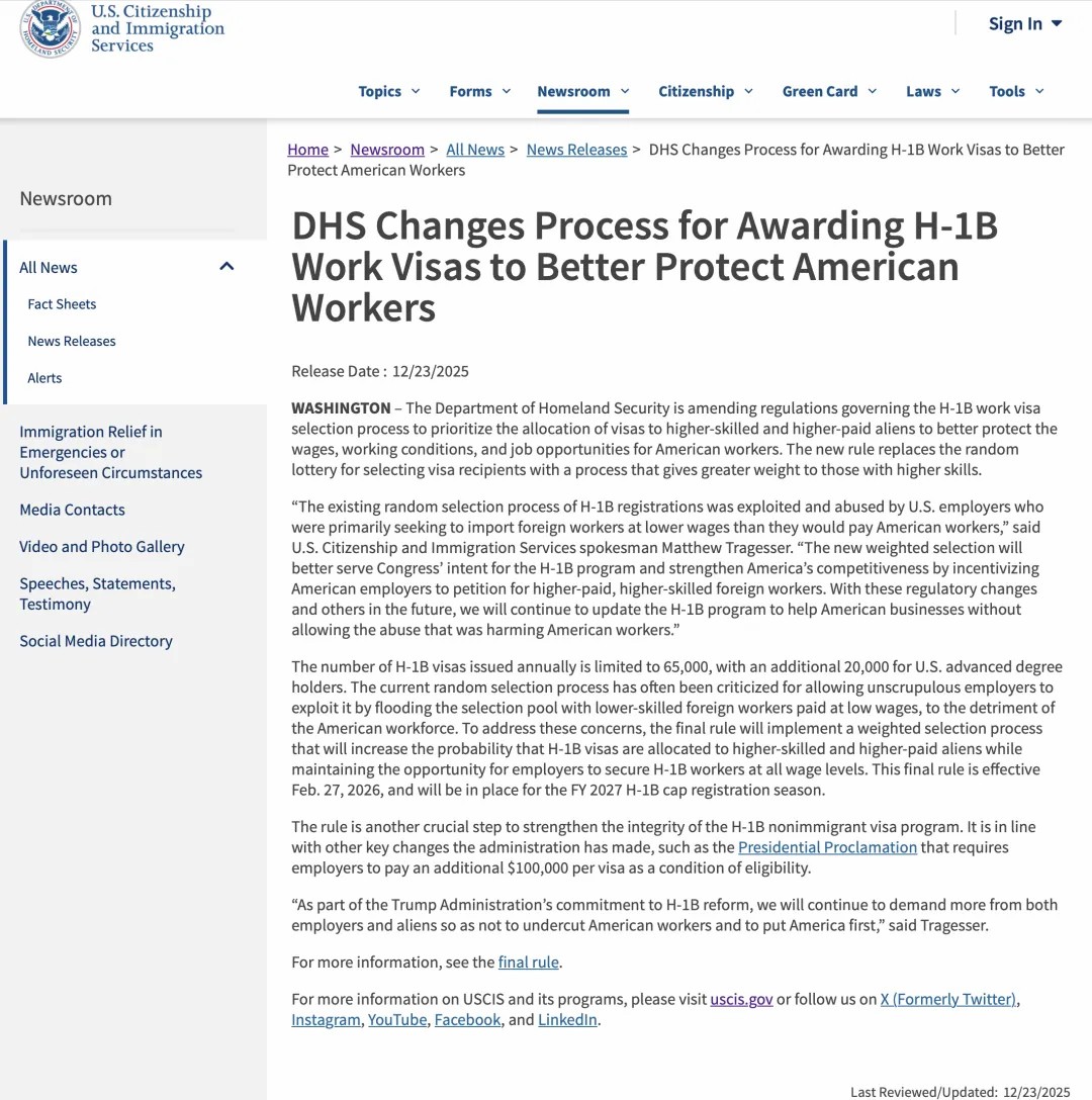 12月23日,美国国土安全部(DHS)正式官宣H-1B改革方案,核心调整只有一个:取消随机抽签,改为按工资水平加权选择,该规则将于2026年2月27日生效,首次适用于2026年3月开启的FY2027 H-1B申请季。