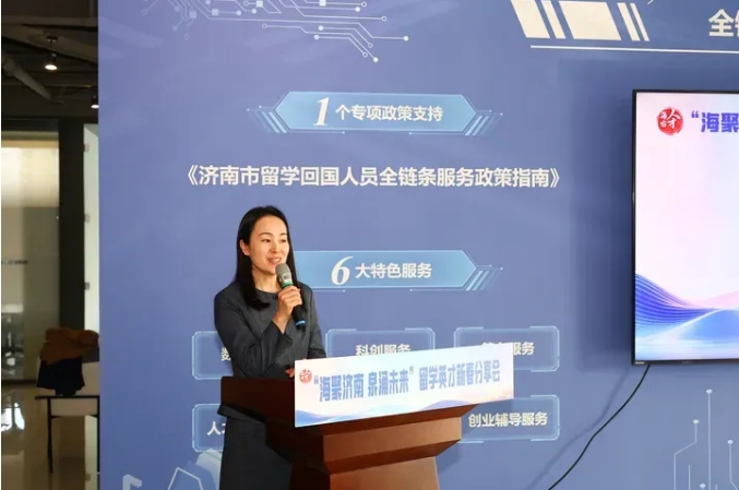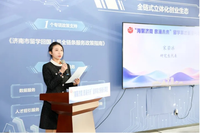 会上,侯总代表留学创业人才分享了自己的创业经验,她留英归国后在济南深耕留学服务行业,扎根济南创业,专注国际教育服务,以创新服务赋能青年成长,用实干回馈城市人才政策支持。并鼓励诺诚学子学成归国,选择济南、扎根济南,在泉城开启就业创业的新征程,共筑泉城美好未来。