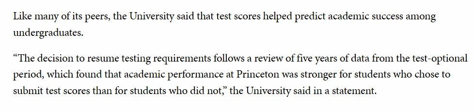 普林斯顿大学表示,恢复标化考试要求是基于五年标化可选时期的实证研究。大学在声明中指出:“在对标化可选期间五年的数据进行审查后发现,在普林斯顿大学,选择提交考试成绩的学生的学业表现比不提交考试成绩的学生更强。”