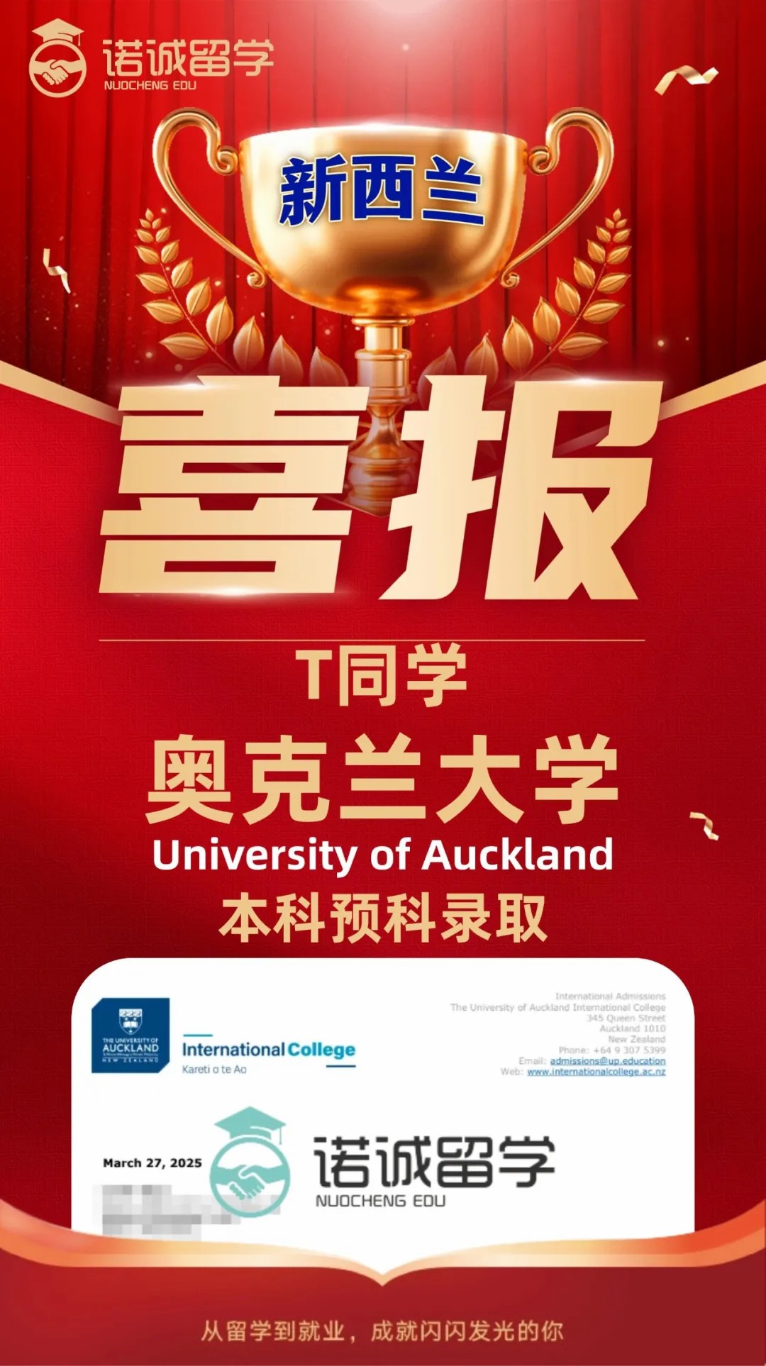 今天想和大家分享一个真实、温暖、超励志的高中生留学案例——来自国内普高的T同学,在高二阶段重新规划赛道,弯道超车,成功拿下世界排名65位的新西兰第一学府奥克兰大学,1月已顺利入境,开启全新人生!
