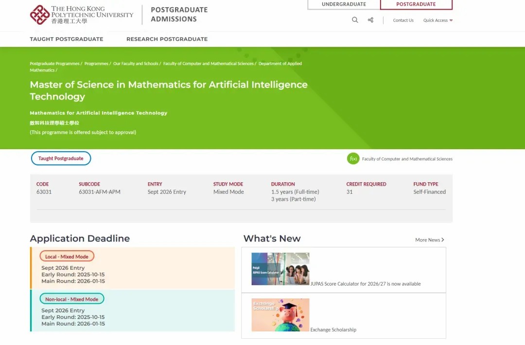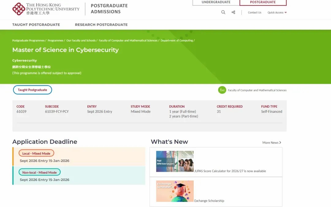 香港理工大学2026秋季入学新增三个硕士专业:网络空间安全硕士、数智科技硕士、卫星工程硕士;首轮申请ddl为2026.1.15。