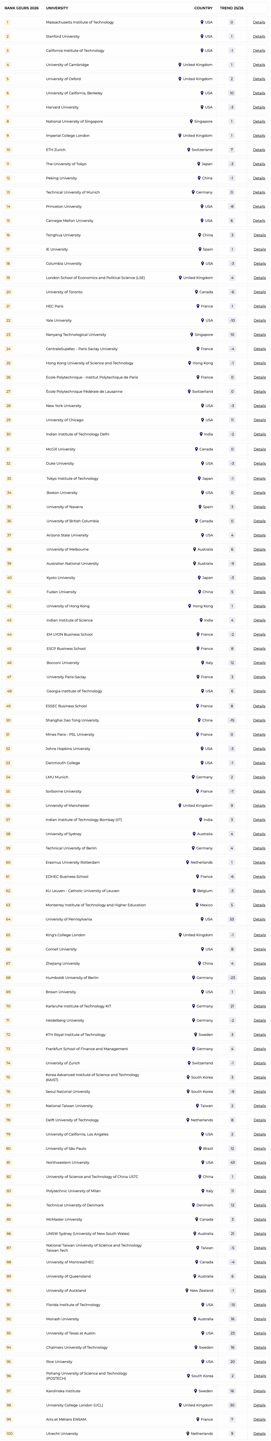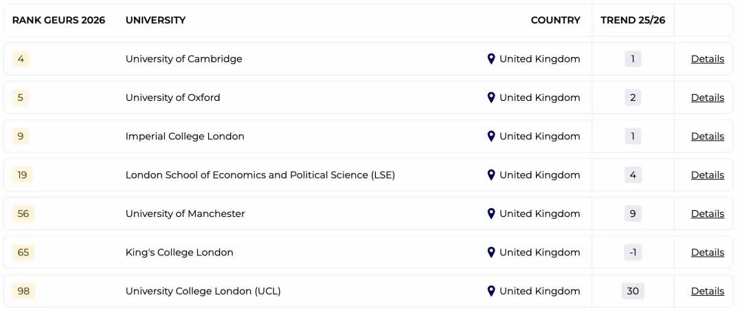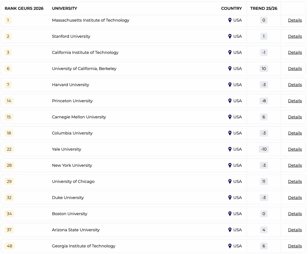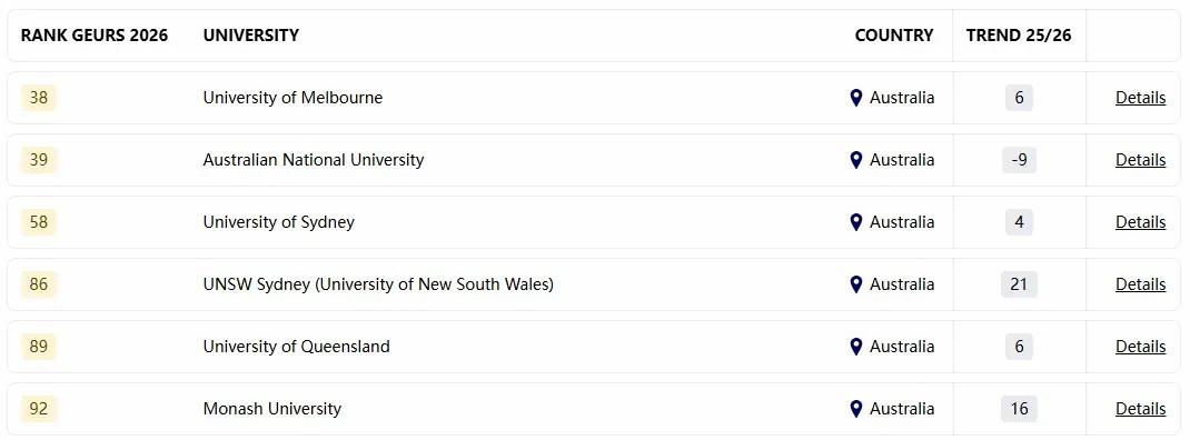 近期,THE(泰晤士高等教育)和Emerging人力资源公司联合发布了2026年度全球大学就业力排行榜(GEURS)。GEURS是一个完全基于雇主观点的排名,也是全球雇主咨询最多的排名之一。对于留学生选择就读的学校,以及未来就业竞争具有一定参考价值。