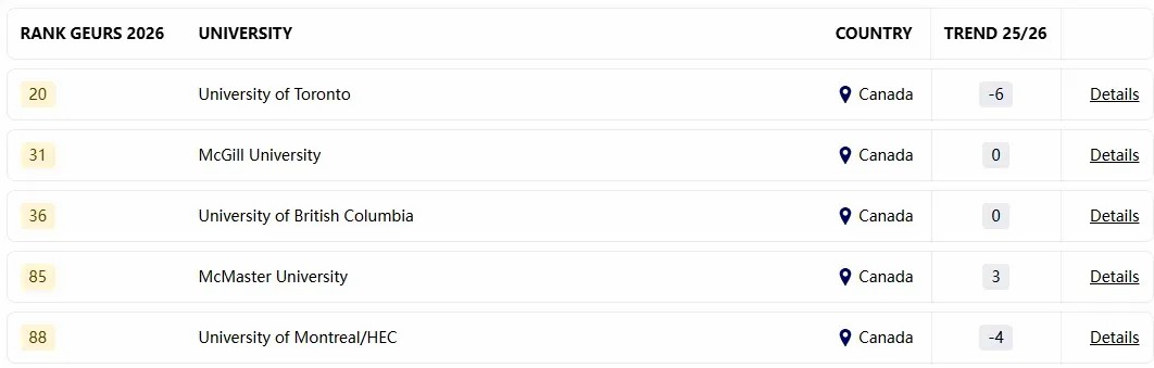 在加拿大高校中,多伦多大学位列第一,全球排名第20位;麦吉尔大学紧随其后,全球排名第31位;不列颠哥伦比亚大学排名第三,全球第36位。