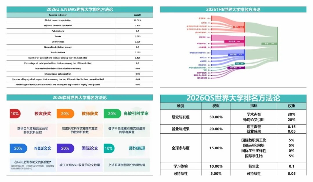 - 软科:理工科福音!几乎纯学术导向,以科研成果、诺奖校友等硬指标为核心,评价客观透明,理工科参考价值高