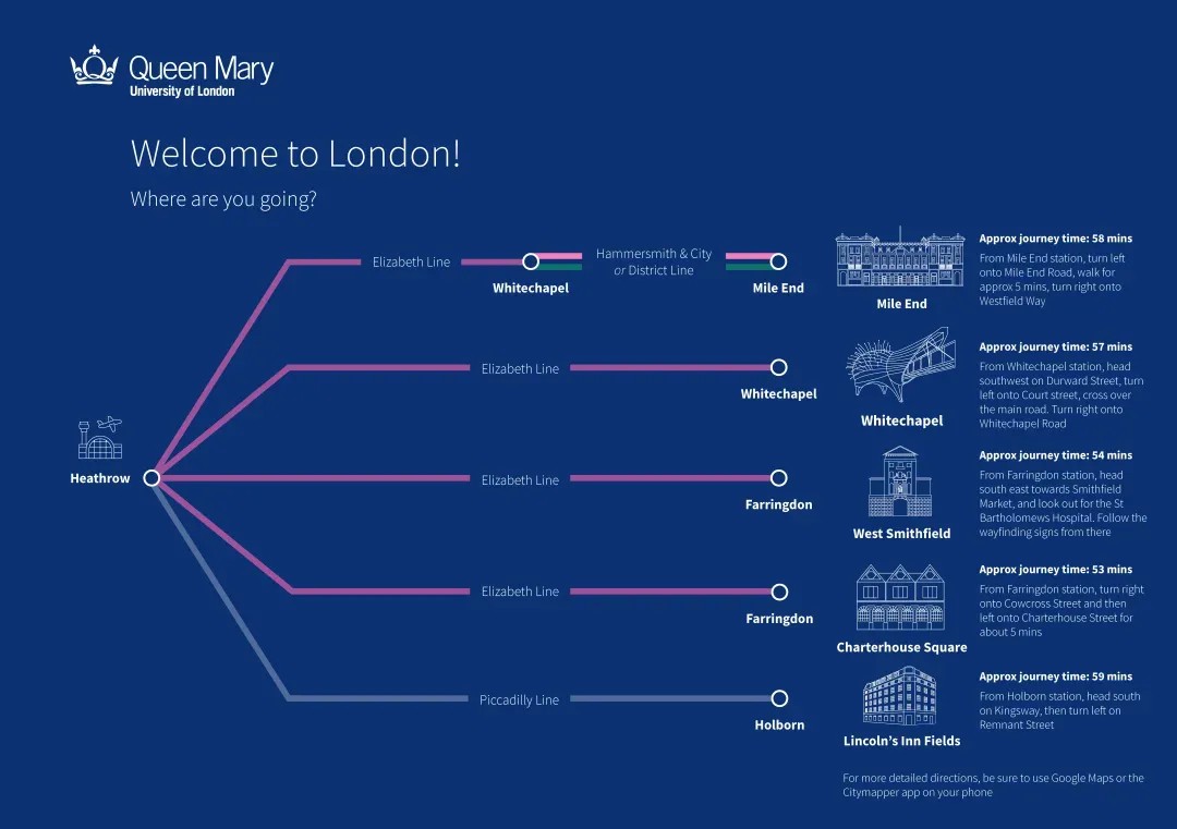 (1)从希斯罗机场到Mile End主校区可以直接从希斯罗机场乘坐伊丽莎白线(Elizabeth Line)至Whitechapel站,换乘District Line或者Hammersmith and City Line至Mile End地铁站。Mile End地铁站无电梯设施,搬运行李可能会有一些困难。