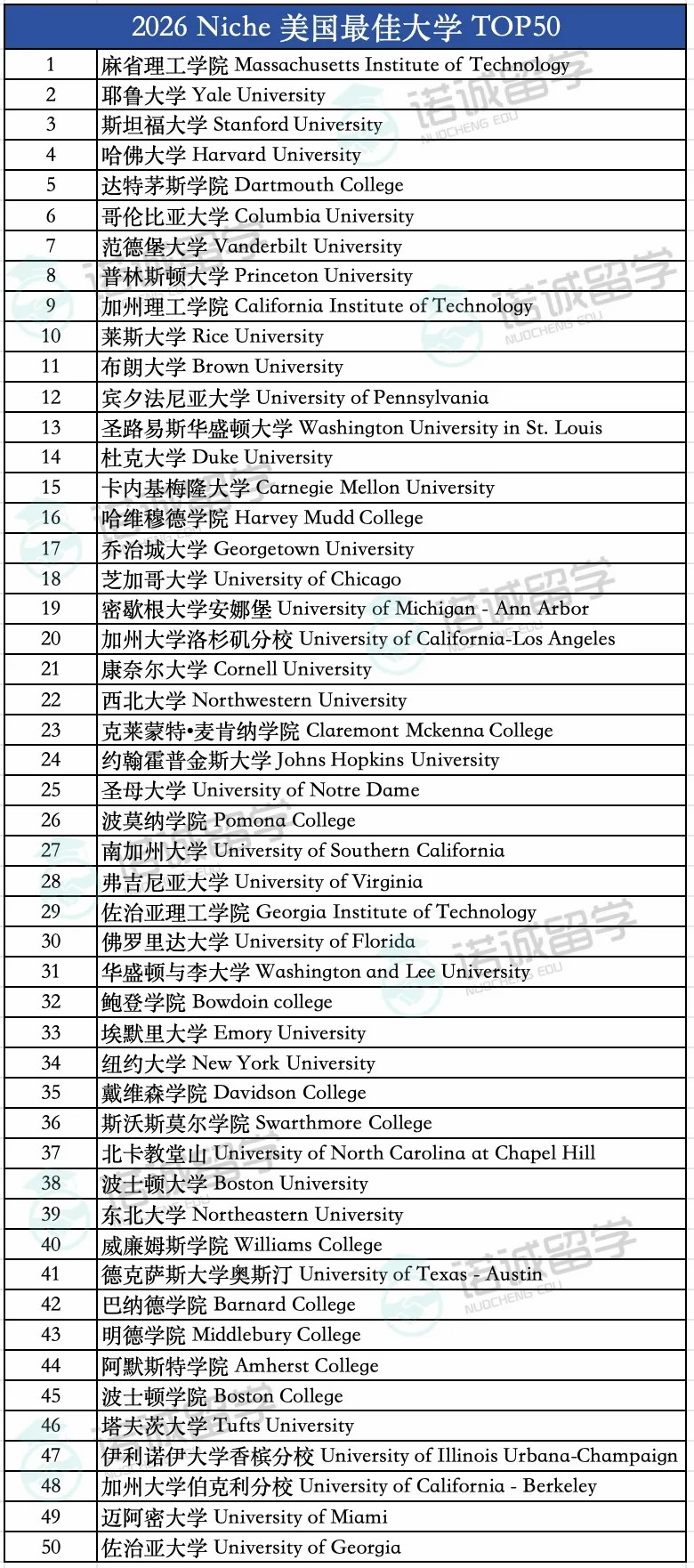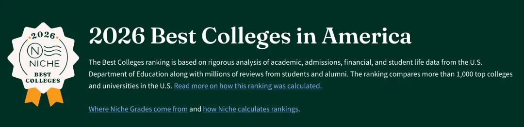 近日,有美国大学“大众点评”之称的Niche网站,发布了2026年美国最佳大学排名。相比于其他排名,Niche排名更加侧重于学生对于学校满意度的调查,可以说更像是一份学生心中理想大学的榜单。话不多说,跟着小诺一起去看看吧!