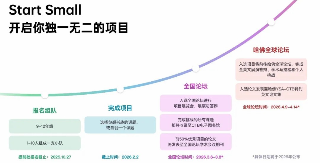 不限国籍和所在地区,任何9-12年级(初三-高三年级)学生都可以个人小队的形式,发起或参与一个自选CTB课题项目,在CTB官网注册报名,跟着CTB的指导步伐,完成一个研究或创新的项目,并将最终成果论文投稿至全国和全球论坛。任何人在任何一年的CTB,只能投稿一份论文。适合对创新能力、原创思维、时间精神、领导合作感兴趣的学生。6-8年级(初中预备年级-初二)将参与CTB Junior。