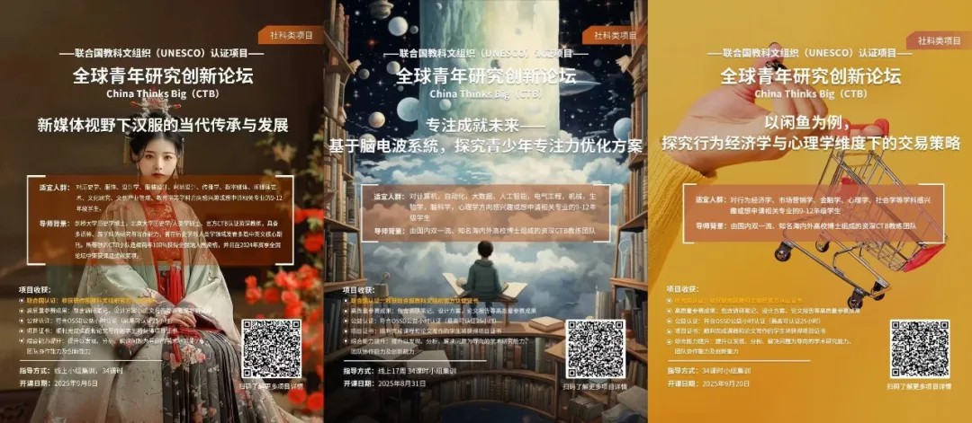 全球青年研究创新论坛(China Thinks Big,简称CTB),最早在2012年由哈佛商学院学者和清华大学经管学院学者联合启动,是以学术研究和社会实践推动创新的国际级别青年交流平台。经过10多年的不断发展和革新,全球数万高中生天马行空的想法在这里生根发芽,通过长期的研究学习和团队协作,不断增强其落地可行性和科学严谨性,持续检验和改进项目成果,最终以论文和报告的形式记录自己的创新发现和实践成果,在CTB全国论坛和全球论坛现场,受到国内外知名大学学者和各行业专家的反馈和点评,成为高中阶段独特的学术研究与团队协作经历。每年参与者的最终学术成果将被收录进入CTB电子图书馆及CTB论文集,成为学术生涯中的第一份学术出版物。CTB从与大学接轨的学科知识出发,鼓励同学们着眼身边生活,以名校学术方法论为蓝本,以原创观点和创新方案践行“⽴⼤志,做⼩事”(Think Big, Start Small)的项目精神,提升⼤学接轨程度(college-readiness),服务⼤学机构的⼈才培养和选拔。