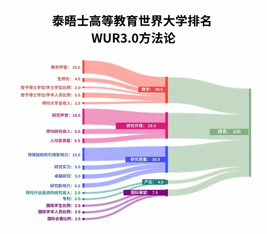 泰晤士高等教育世界大学排名是全球唯一一个对研究密集型大学的所有核心任务进行评判的全球绩效表,这些核心任务包括教学、科研、知识转移和国际展望。使用18经过仔细校准的绩效指标,从而提供最全面、最平衡的比较,深受学生、学者、大学领导、行业和政府的信赖。 “出境交换生”是其中一项新指标,虽然目前其权重为零,但将来会被纳入计算中。排名的绩效指标仍然分为5个方面,但命名有所更改,分别为:教学、研究环境、研究质量、国际展望和产业。