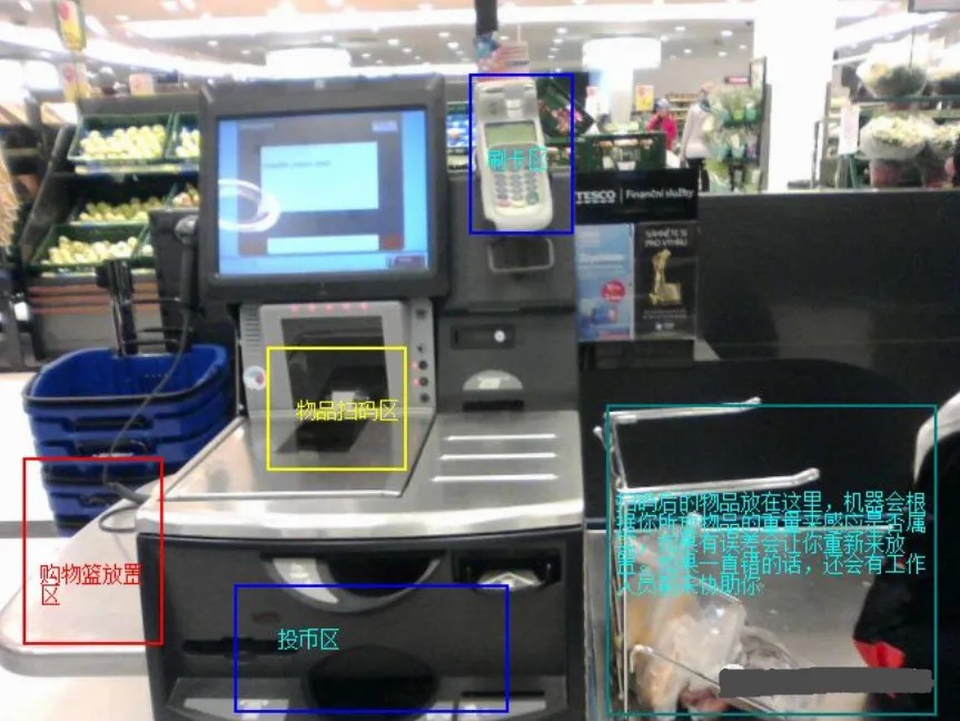 机器非常智能,红色位置是放购物篮的位置。拿起物品到黄色区域扫码,然后放到右边的区域,机器会根据你所放物品的重量来感应是否属实,如果有误差的话会让你重新放置。一旦错误的话,机器就会呼叫工作人员前来协助你。购物袋有的是直接挂在机器上,你选择购买就好。有的是要到工作人员那里购买,不过他就在你们身边。等结算的时候,可以选择Cash or Card,购物就完成了。
