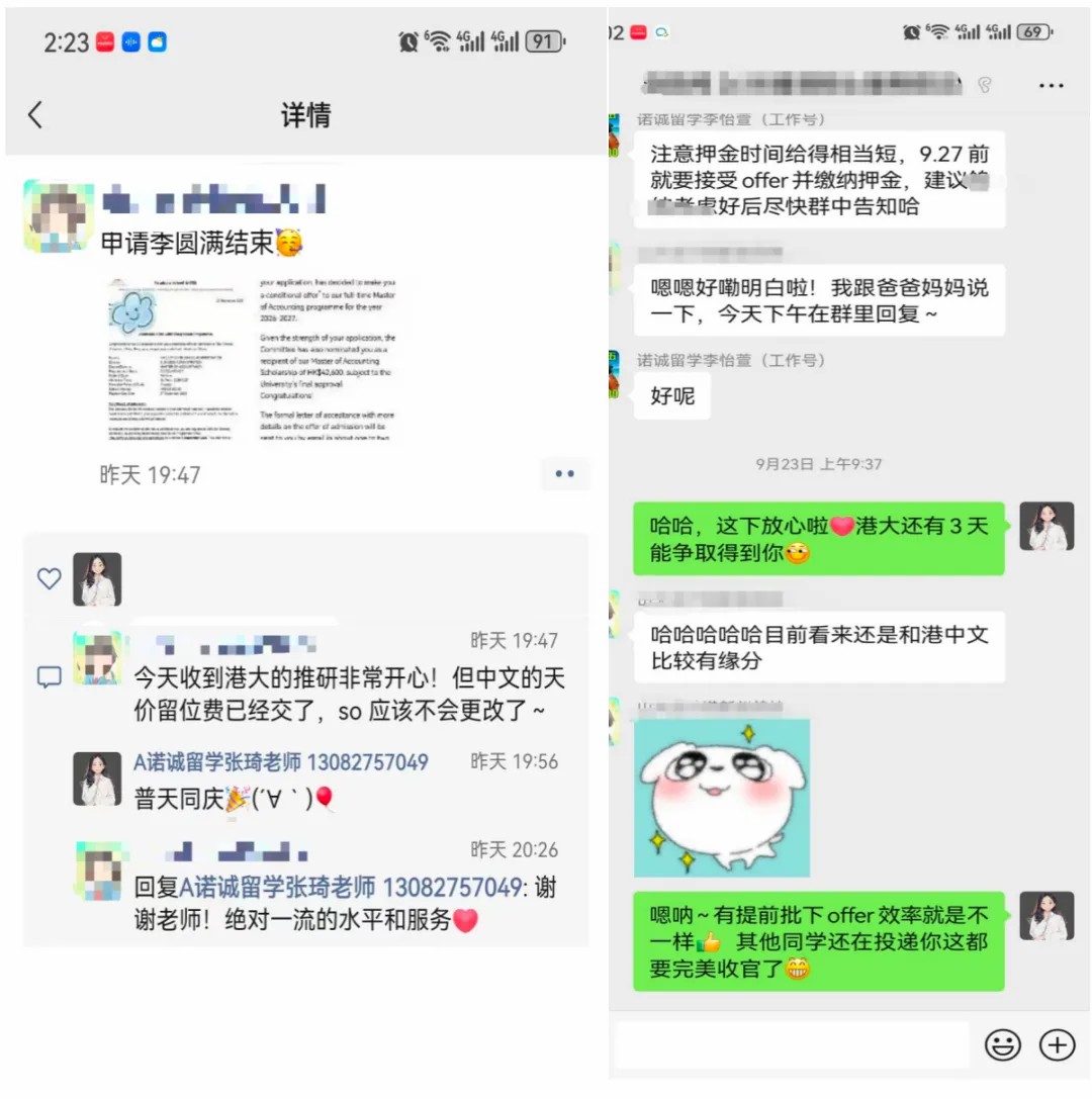 在整个录取过程中,诺诚留学的老师一直对学生认真负责,尽职尽责地为同学进行答疑解惑!在收到OFFER第一时间,诺诚留学的老师就送上了祝福,与学生一起分享喜悦~
