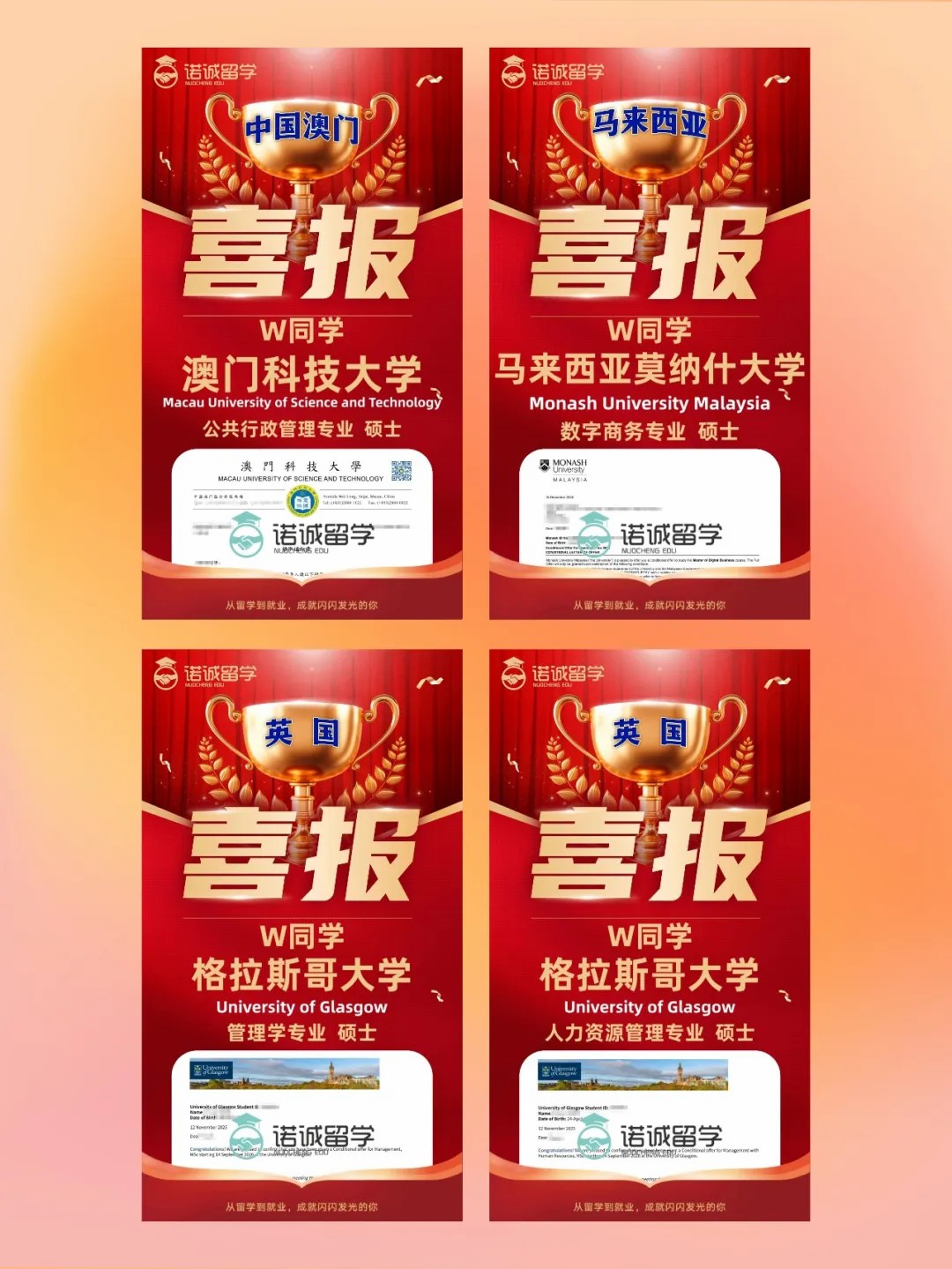 申请初期,W同学正全力冲刺考公,精力被大幅占用,完全没为雅思学习预留充足时间。这一现实难题让留学规划一度陷入僵局,诺诚老师第一时间与学生及家长深入沟通,结合学生情况精准规划——锁定澳门科技大学中文授课专业作为保底选项。诺诚的老师还为W同学量身定制了全面的面试指导,从流程梳理、问题预判到应答技巧打磨,全程细致陪伴,最终帮助学生顺利斩获澳门科技大学录取通知书,为留学之路筑牢基础!