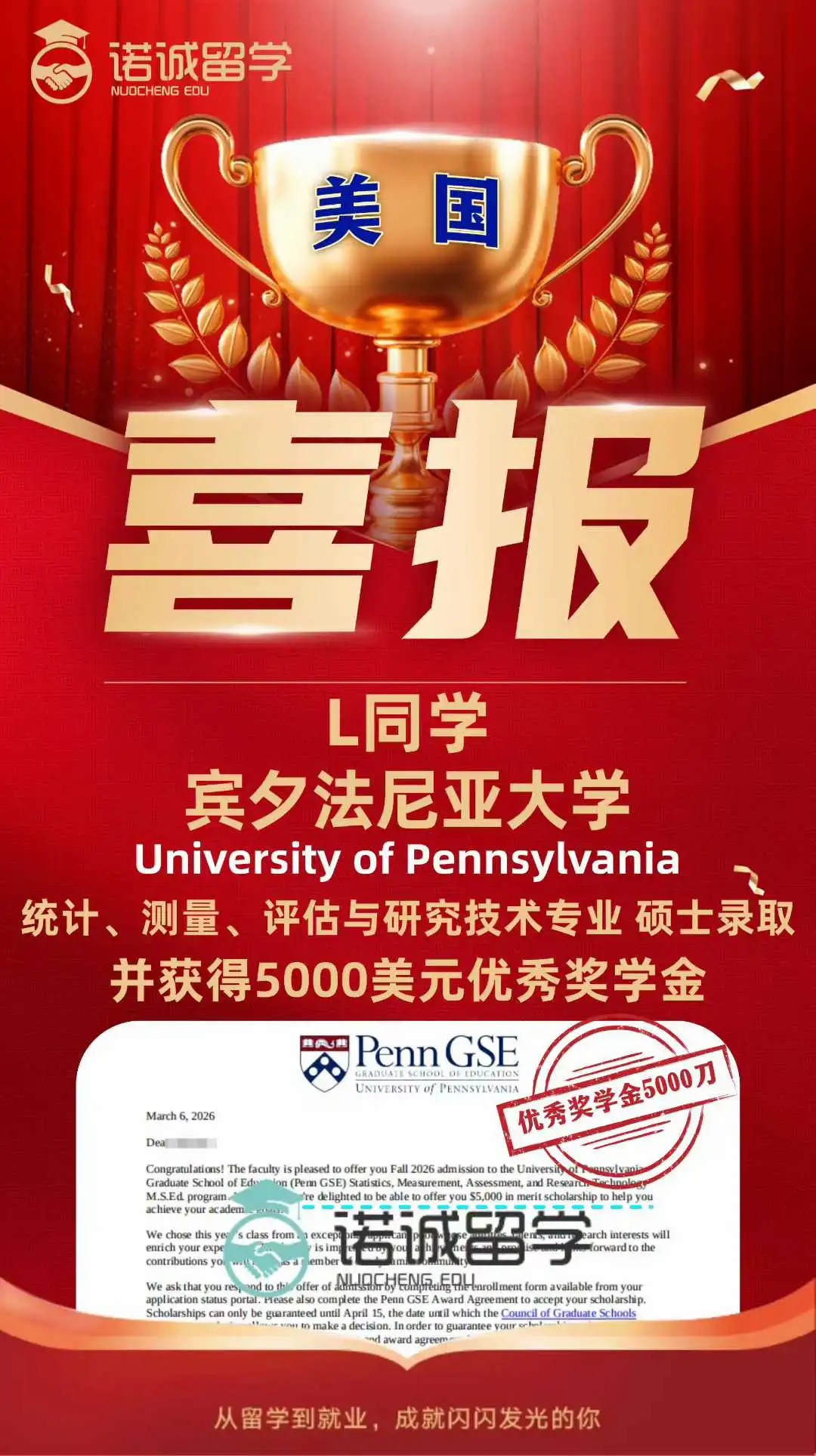L同学此次拿下的统计、测量、评估与研究技术硕士项目,是宾大极具优势的王牌专业之一,聚焦数据统计、科研评估、技术应用等核心领域,课程体系贴合行业前沿,就业前景广阔,在全美相关专业领域排名名列前茅。5000美元优秀奖学金的加持,不仅减轻了留学的经济压力,更彰显了宾大对L同学学术水平、专业潜力的高度认可。这份亮眼的成绩,是L同学多年深耕学业的最好回馈,也是诺诚留学专业助力的完美成果。