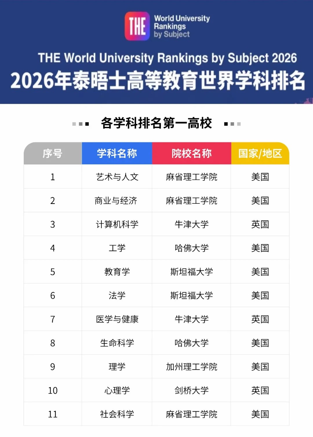 2026年泰晤士高等教育世界学科排名,入榜大学比以往更加多样化。本次排名涵盖11个学科大类。今天跟着小诺一起看看每个学科前十名花落谁家吧?